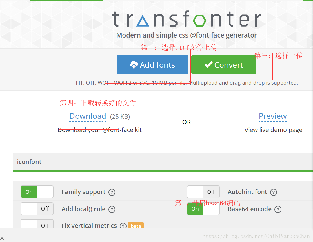 这里推荐一个转换字体文件的网站 transfonter ,具体转换步骤如下: