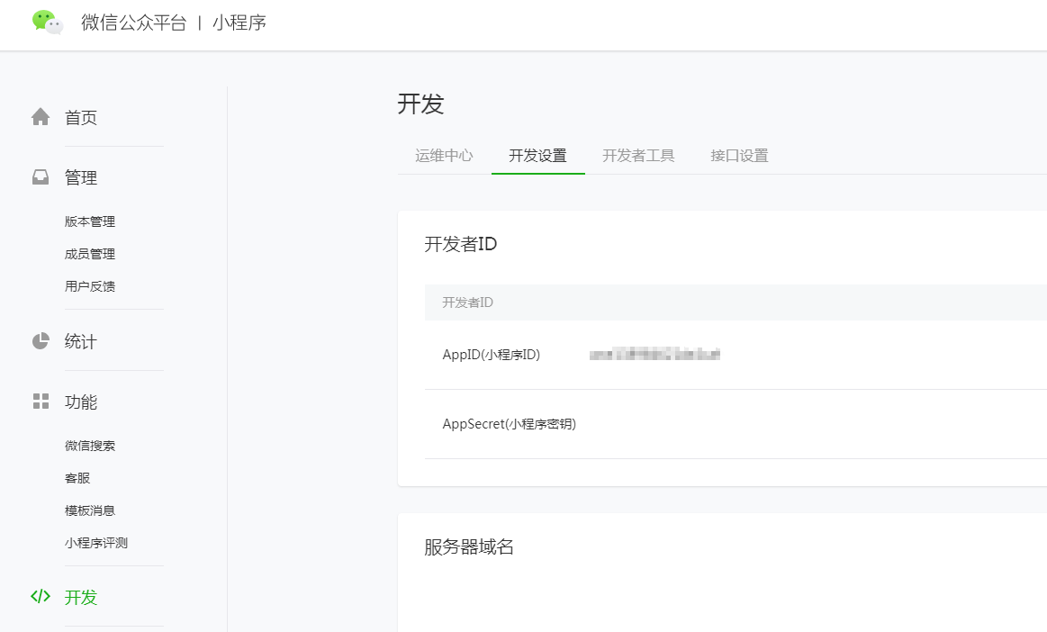 1、小程序开发需要用到开发者ID,所以还没有注册小程序的需要先去注册 小程序注册页。注册好后进入小程序管理系统,点击菜单:"开发--开发设置" 获取AppID。
